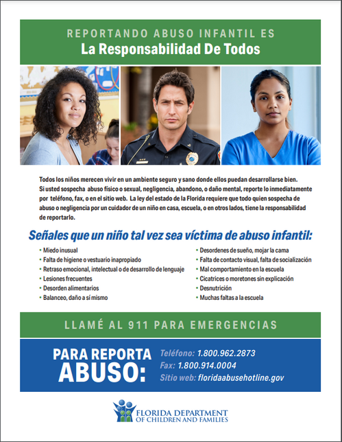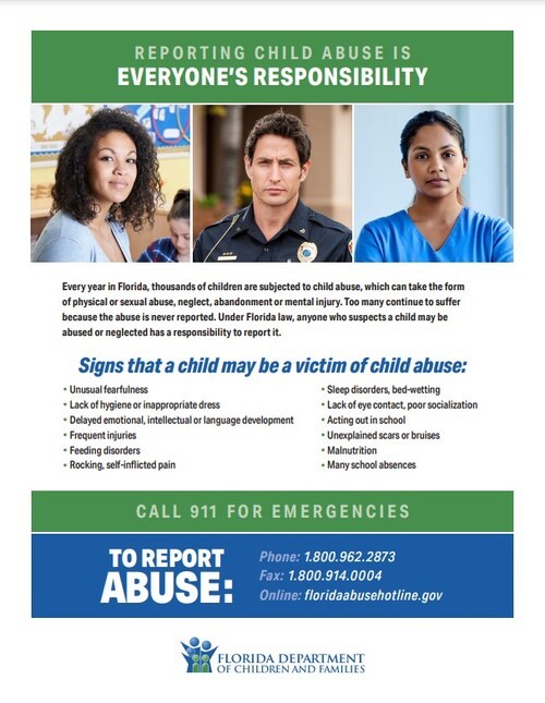 Employees are required by law to read and sign the “Child Abuse and Neglect Reporting Requirements” (CF-FSP 5337). All child care personnel are mandated by law to report their suspicions of child abuse, neglect, or abandonment to the Florida Abuse Hotline in accordance with s. 39.201 of the Florida Statutes (F.S.). Reports must be made immediately to the Florida Abuse Hotline Information System at 1-800-96-ABUSE (1-800-96-2873).