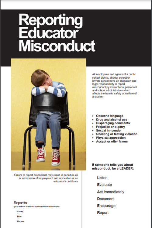 All instructional personnel, educational support employees, and school administrators have an obligation to report misconduct by instructional personnel, educational support employees, and school administrators which affects the health, safety, or welfare of a student. Examples of misconduct include obscene language, drug and alcohol use, disparaging comments, prejudice or bigotry, sexual innuendo, cheating or testing violations, physical aggression, and accepting or offering favors. Reports of misconduct of employees should be made to